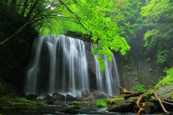 安達太良山系船明神山に源をもつ不動川にかかる名瀑で、滝元には不動尊を祀っています。岩肌に沿って水がスダレのように流れ落ちる勇壮な男滝と、その西側にひっそりとたたずむ優美な女滝が好対照を見せています。